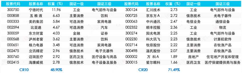 從指數(shù)前二十大權(quán)重股來(lái)看,深證50指數(shù)覆蓋多個(gè)不同領(lǐng)域的細(xì)分行業(yè)龍頭,如動(dòng)力電池龍頭寧德時(shí)代(300750)、醫(yī)療企業(yè)龍頭邁瑞醫(yī)療(300760)、人工智能龍頭科大訊飛(002230)、新能源汽車龍頭比亞迪(002594)等。根據(jù)國(guó)證三級(jí)行業(yè)統(tǒng)計(jì),所有樣本公司自由流通市值均在所屬細(xì)分行業(yè)排名前三,其中23家排名第一。