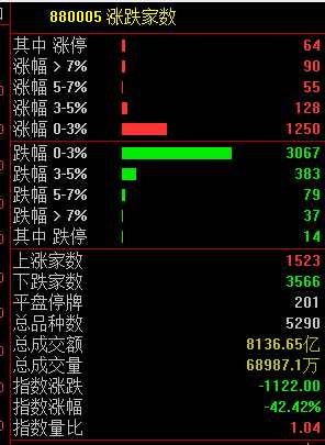 共1523只個股上漲,3566只個股下跌