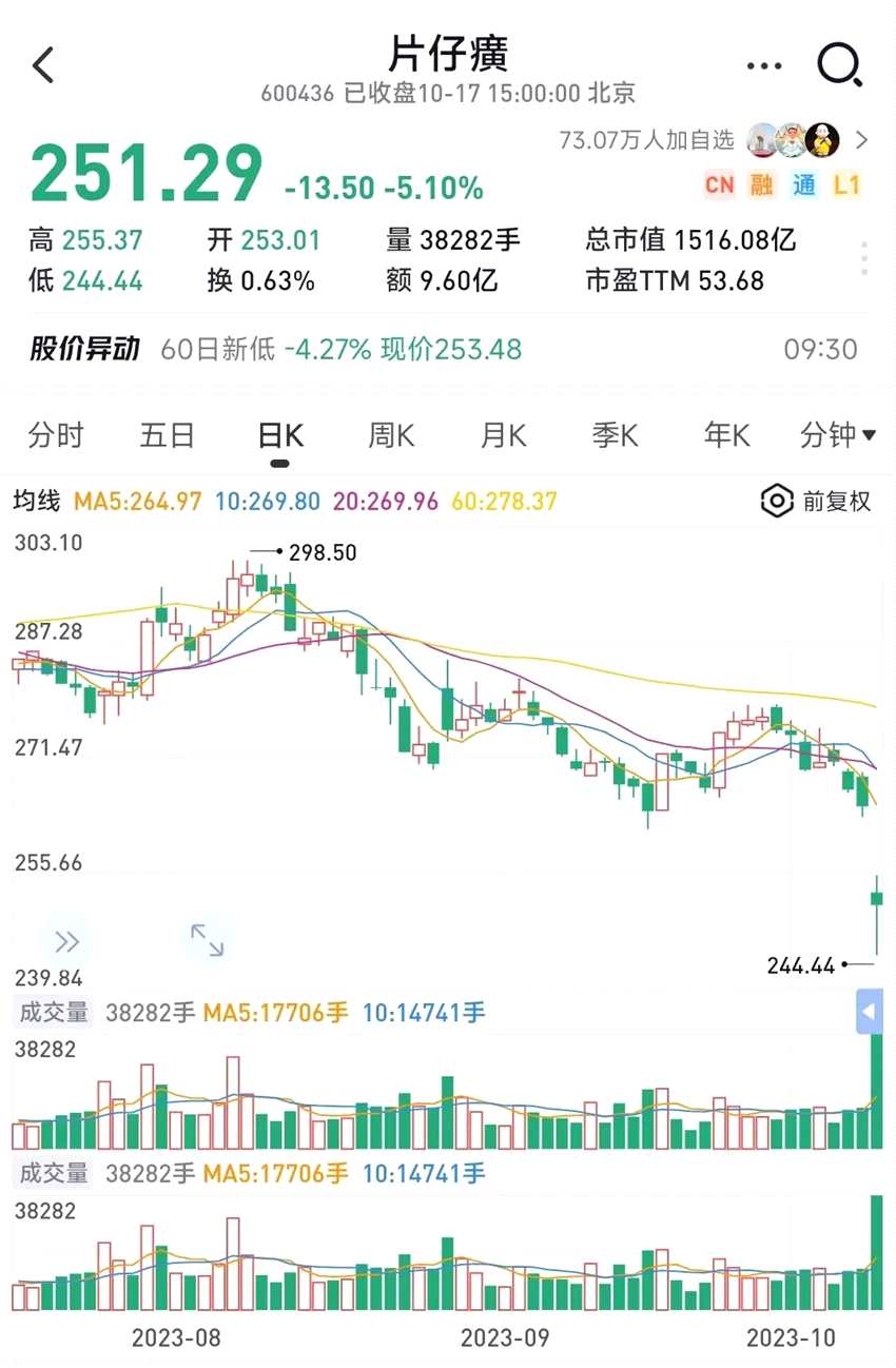 今天一開盤,片仔癀直線跳水,一度大跌超7%,截至收盤跌5%,股價創(chuàng)年內新低。