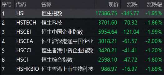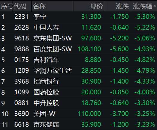 港股市場(chǎng)三大指數(shù)集體走低,跌近2%。消費(fèi)、金融、科技、汽車等走低,李寧、中國(guó)人壽(601628)、京東集團(tuán)均跌超5%,小鵬汽車、蔚來(lái)跌超8%。