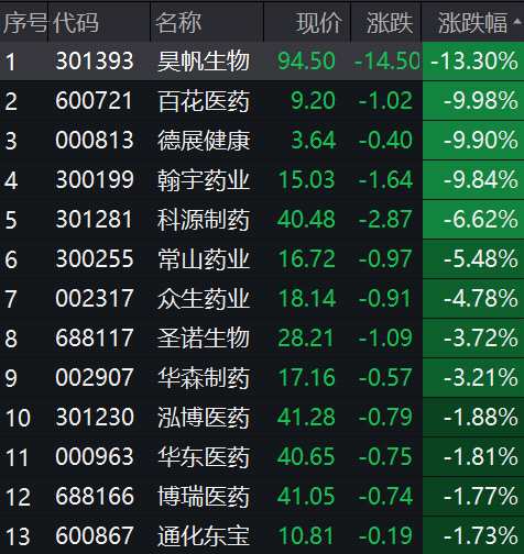 其中,百花醫(yī)藥(600721)、德展健康(000813)跌停,昊帆生物(301393)跌超10%,翰宇藥業(yè)(300199)、科源制藥(301281)均有明顯跌幅。