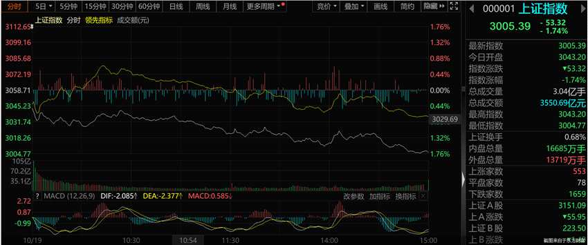 10月19日,A股三大股指集體收跌,均創(chuàng)年內(nèi)新低;其中滬指收跌1.74%,報(bào)3005.39點(diǎn),險(xiǎn)守3000點(diǎn);深證成指收跌1.65%;創(chuàng)業(yè)板指收跌1.28%。
