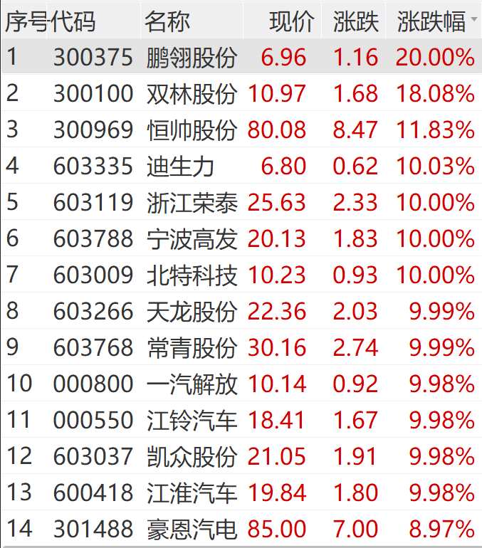 上午汽車板塊整體走高,新能源整車表現(xiàn)居前。恩捷股份(002812)、江鈴汽車(000550)、一汽解放(000800)、江淮汽車(600418)等十余股大舉漲停。
