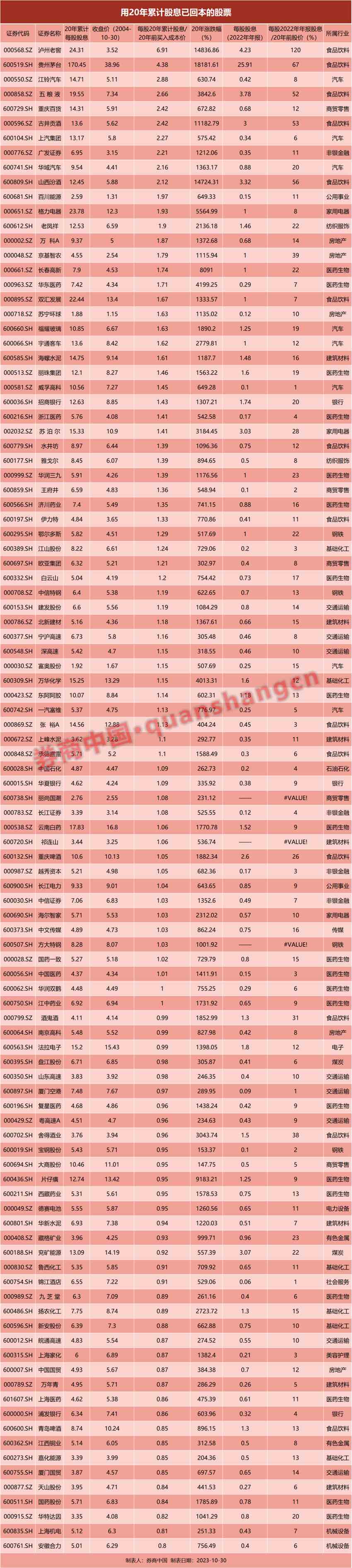 統(tǒng)計數(shù)據(jù)顯示,103家上市公司在過去20年間通過股息已經(jīng)接近或者大幅收回成本,20年股息回本的公司占到有20年上市記錄公司的10%。在經(jīng)歷兩輪牛熊之后,它們給股東帶來了合理乃至超預期的收益。在20年股息回本的公司中,46家公司漲幅超過10倍,占到有20年上市記錄公司的5%。這些公司在過去20年的最大漲幅為181.8倍,最小漲幅為1.41倍。