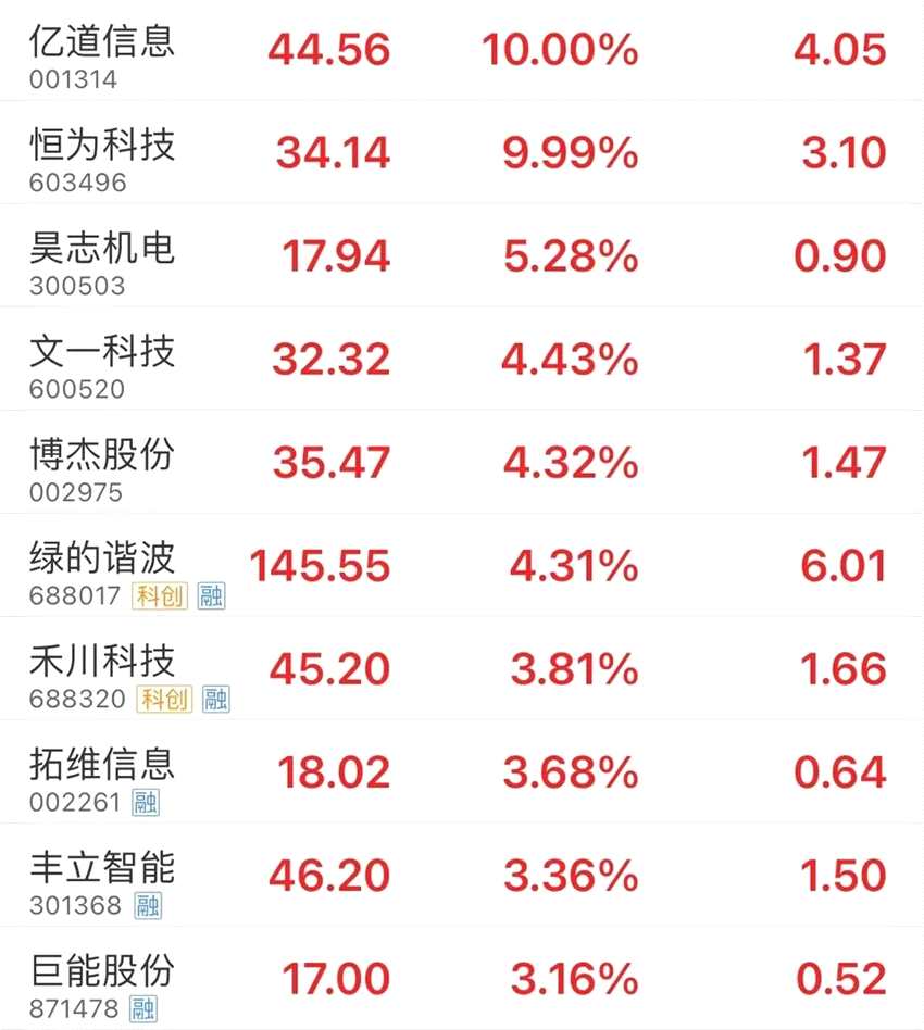 機(jī)器人概念股早盤也走勢(shì)活躍,昊志機(jī)電(300503)盤中一度漲10%。截至午間收盤,億道信息(001314)、恒為科技(603496)漲停,昊志機(jī)電、文一科技(600520)、博杰股份(002975)、綠的諧波、禾川科技等跟漲。