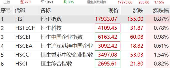 港股市場今日高開:恒生指數(shù)漲0.87%,恒生國企漲1.46%,恒生科技漲1.46%;截至發(fā)稿漲幅略有收窄。內(nèi)房股領(lǐng)漲恒指,龍湖集團(tuán)、華潤置地、碧桂園服務(wù)等漲幅居前。