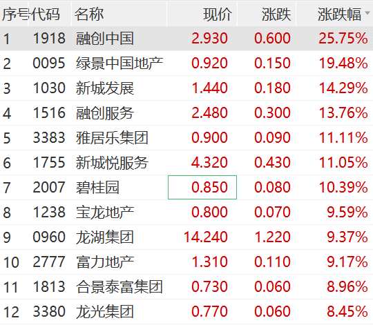 港股地產(chǎn)板塊同樣發(fā)力,內(nèi)房股走高。融創(chuàng)中國盤中漲近27%,碧桂園、富力地產(chǎn)、龍湖集團(tuán)均有明顯漲幅。