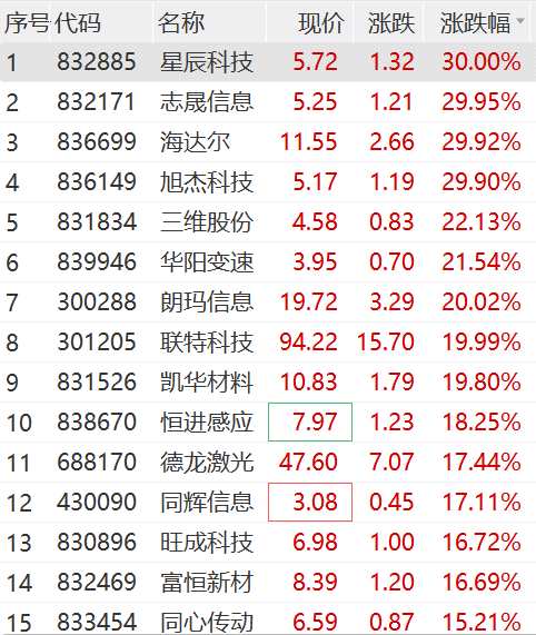 11月21日上午,北交所繼續(xù)發(fā)力,多只個(gè)股漲幅居于A股市場前列。志晟信息、海達(dá)爾、星辰科技、旭杰科技紛紛拉出30CM漲停,三維股份(603033)、華陽變速等多股漲超20%。