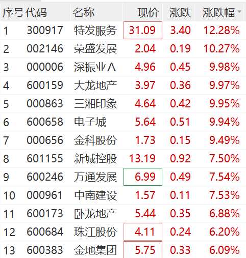 個(gè)股方面,榮盛發(fā)展(002146)、深振業(yè)A、大龍地產(chǎn)(600159)、三湘印象(000863)、電子城、金科股份(000656)等接連漲停,特發(fā)服務(wù)(300917)漲超12%。