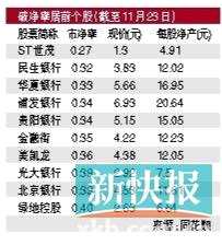 記者經(jīng)統(tǒng)計(jì),截至11月23日,A股市場(chǎng)破發(fā)股有779只,其中包括相對(duì)發(fā)行價(jià)破幅超50%的有70只,其中包括金科股份(000656)發(fā)行價(jià)為100元/股,(后復(fù)權(quán))現(xiàn)價(jià)1.84元/股,股價(jià)跌幅超八成。金杯汽車(600609)和富通信息(000836)也是現(xiàn)價(jià)較發(fā)行價(jià)跌幅超八成。從破凈股來看,截至目前,有345只個(gè)股股價(jià)低于每股凈資產(chǎn),破凈率前十的個(gè)股中有6只是銀行股,包括民生銀行、華夏銀行和浦發(fā)銀行等均低于0.4倍,ST世茂(600823)市凈率最低為0.27倍。