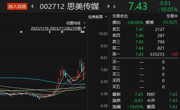 思美傳媒(002712)今日開(kāi)盤即一字跌停,截至收盤,該股報(bào)7.43元,跌停板上封單超50萬(wàn)手。昨日,該股盤中一度觸及跌停,午后突然直線拉升漲停,上演“地天板”走勢(shì)。