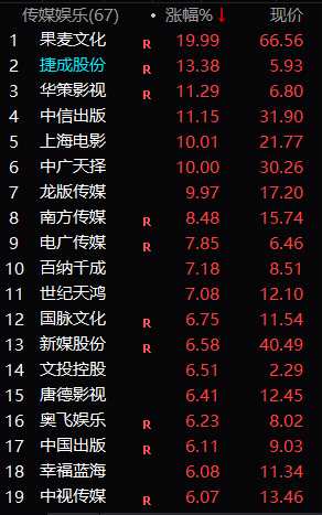 另一個(gè)引人關(guān)注的是傳媒娛樂(lè)板塊,今天板塊整體漲幅居第二位,板塊中的果麥文化(301052)、上海電影(601595)、中廣天擇(603721)、龍版?zhèn)髅剑?05577)等個(gè)股漲停,捷成股份(300182)漲超13%,華策影視(300133)、中信出版(300788)漲超10%;