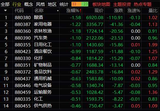 跌幅榜上,釀酒、農(nóng)林牧漁、汽車(chē)、日化、家電、酒店餐飲等板塊跌幅超過(guò)1%。