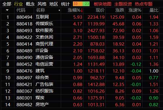 A股早盤(pán)弱勢(shì)震蕩,午后,互聯(lián)網(wǎng)、傳媒娛樂(lè)、軟件服務(wù)板塊大爆發(fā),拉動(dòng)三大股指翻紅,直至收盤(pán),滬指、創(chuàng)業(yè)板指小幅上漲,深證指數(shù)小幅下跌。