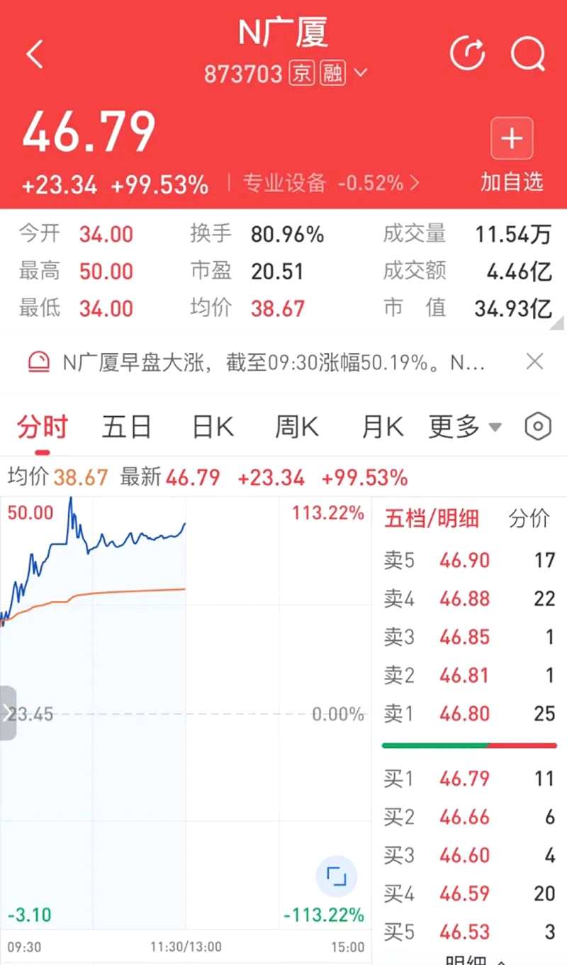 北交所新股N廣廈(廣廈環(huán)能)今日上市,開盤較發(fā)行價(jià)高開45%,連續(xù)競價(jià)階段股價(jià)繼續(xù)上行,因“盤中交易價(jià)格較當(dāng)日開盤價(jià)首次上漲達(dá)到或超過30%”而觸發(fā)一次臨停。截至午盤,N廣廈漲幅達(dá)99.53%,半日成交4.46億元。
