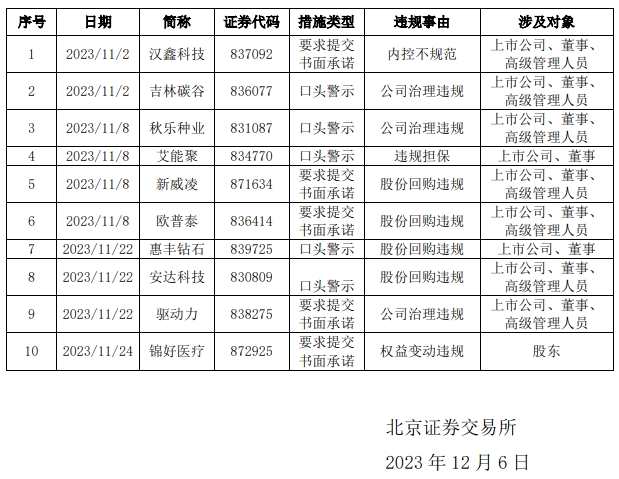 2023年12月6日消息,北交所發(fā)布公告,11月份,漢鑫科技等10家公司,因內(nèi)控不規(guī)范、公司治理違規(guī)等,被采取要求提交書面承諾、口頭警示等措施。