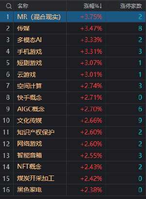 12月11日,大盤全天探底回升,創(chuàng)業(yè)板指領(lǐng)漲。盤面上,AI應(yīng)用方向繼續(xù)活躍,其中傳媒股集體大漲,出版?zhèn)髅?、山東出版(601019)、龍版?zhèn)髅剑?05577)、皖新傳媒(601801)等近10股漲停。多模態(tài)概念股維持強(qiáng)勢,因賽集團(tuán)(300781)漲超10%,云鼎科技(000409)、蘇州科達(dá)(603660)漲停。MR概念股震蕩走強(qiáng),五方光電(002962)、億道信息(001314)漲停。券商等金融股午后拉升帶動指數(shù)反彈,浙商證券(601878)漲停。下跌方面,鋰礦股集體調(diào)整,吉翔股份(603399)跌超5%??傮w上個股漲多跌少,全市場超3900只個股上漲。滬深兩市今日成交額9115億,較上個交易日縮量503億。板塊方面,傳媒、MR、多模態(tài)、煤炭等板塊漲幅居前,鋰礦、食品、白酒、黃金等板塊跌幅居前。截至收盤,滬指漲0.74%,深成指漲0.82%,創(chuàng)業(yè)板指漲1.25%。