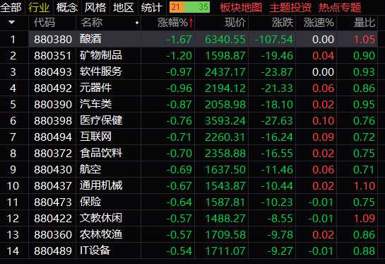 A股午后翻綠三大股指小幅收跌 釀酒、汽車等板塊跌幅居前