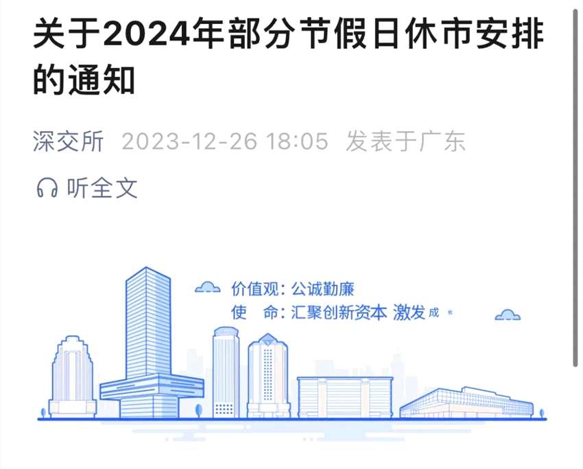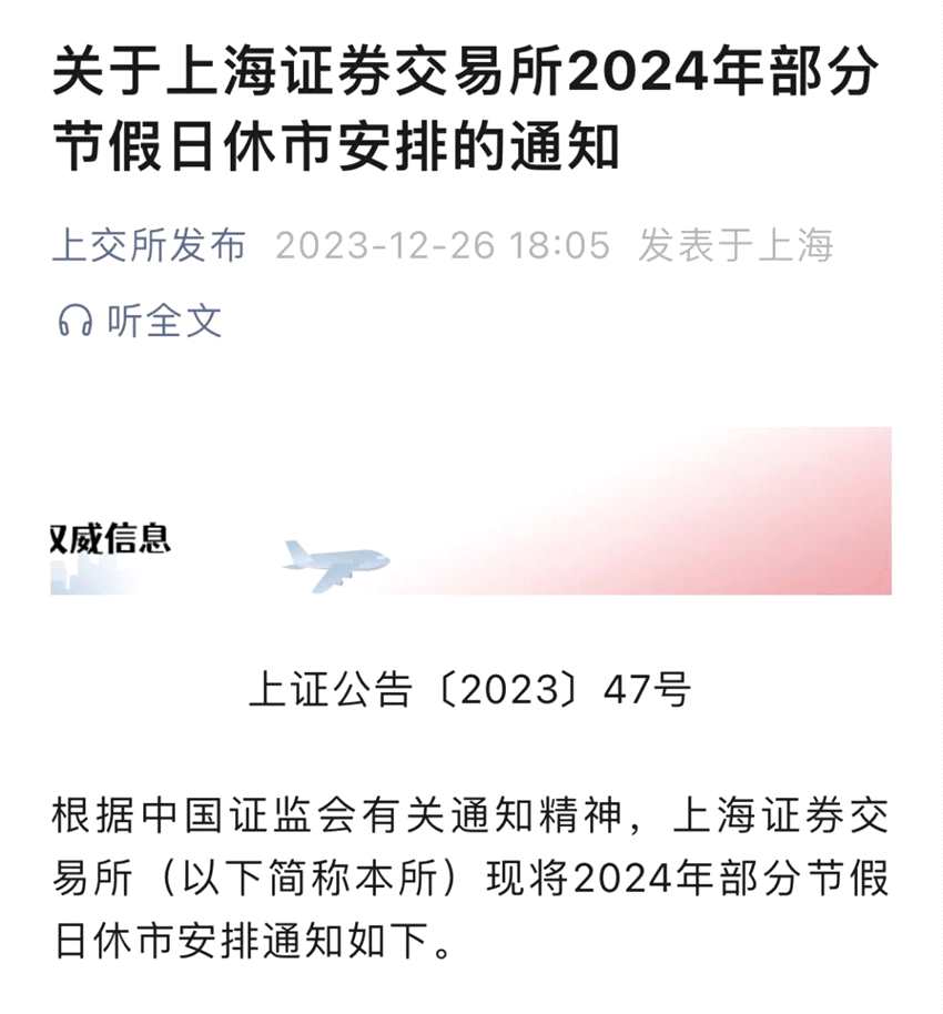 滬深交易所和北交所發(fā)布2024年休市安排。其中,2023年12月30日(星期六)至2024年1月1日(星期一)休市;2月9日(星期五)至2月17日(星期六)休市,2月19日(星期一)起照常開市。