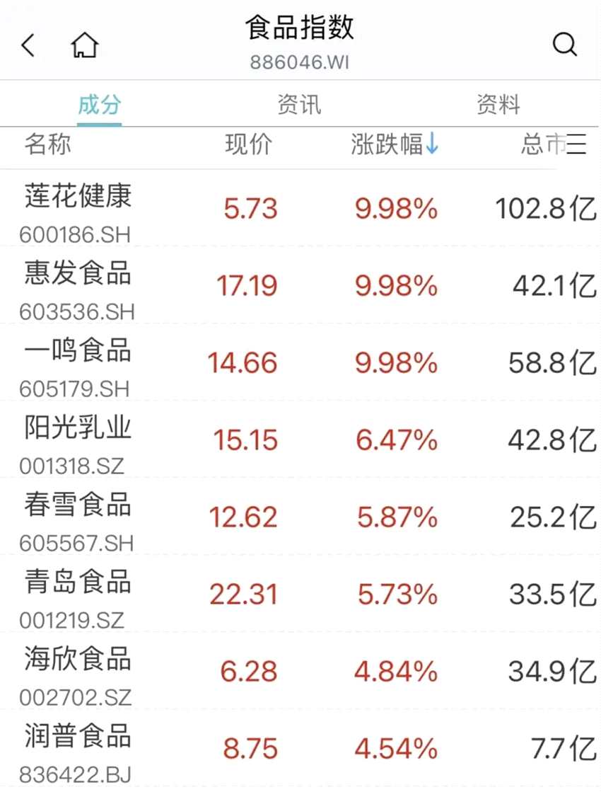 此外,食品股盤中同樣快速拉升,蓮花健康(600186)、惠發(fā)食品(603536)、一鳴食品(605179)漲停,陽光乳業(yè)(001318)、春雪食品(605567)等跟漲。