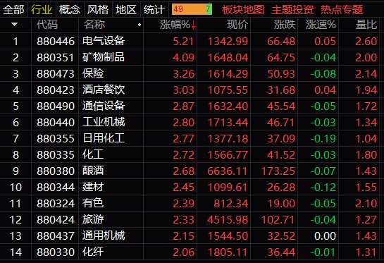 板塊方面:電氣設(shè)備漲超5%,保險、酒店餐飲、通信、化工、釀酒、有色、旅游、房地產(chǎn)等板塊漲超2%;
