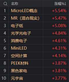板塊題材上,MicroLED概念、MR、PEEK材料等板塊領(lǐng)漲;港口航運(yùn)、房地產(chǎn)開發(fā)等板塊飄綠。