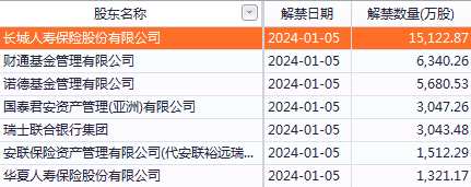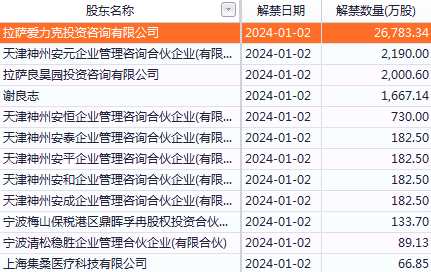 本周解禁數(shù)量最多的是粵水電(002060),該公司將于2024年1月5日解禁3.61億股,占總股本比例9.61%,解禁比例一般,解禁股類(lèi)型是定向增發(fā)機(jī)構(gòu)配售股份。解禁明細(xì)如下: