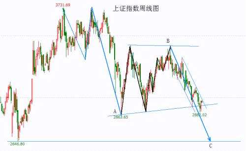 反彈是否結(jié)束還不能下定論,短線可能還有反復(fù),但出現(xiàn)如某私募魔女說(shuō)的“逼空”是不太可能的。從上證指數(shù)周線圖來(lái)看,三角形破位后出現(xiàn)反抽,依然處于下降通道中。當(dāng)前依然只能認(rèn)為是下跌中繼形態(tài),如果再度跌破2882點(diǎn)進(jìn)而跌破2863點(diǎn),那么下一目標(biāo)將指向2646點(diǎn)?,F(xiàn)依然認(rèn)為滬指處于C浪中,下跌仍沒(méi)有到位。