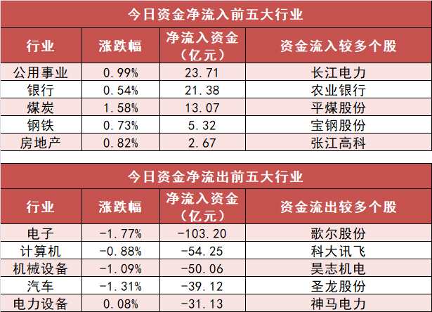 3、公用事業(yè)行業(yè)凈流入23.71億元居首