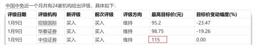 中信證券1月9日發(fā)布評級報告稱,維持中國中免“買入”評級,最高目標(biāo)價為115元。