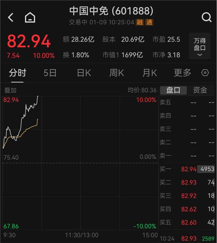 1月9日早盤,機(jī)構(gòu)重倉股中國中免高開高走,截至發(fā)稿時,觸及漲停,總市值逼近1700億元。