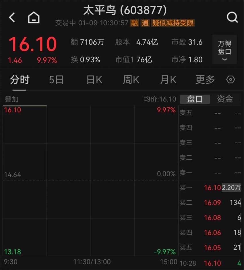 1月9日,太平鳥一字漲停,截至發(fā)稿,報16.10元,漲停板上封單逾2萬手。此前,該股已經(jīng)連續(xù)5個交易日下跌,昨日跌幅高達(dá)9%。
