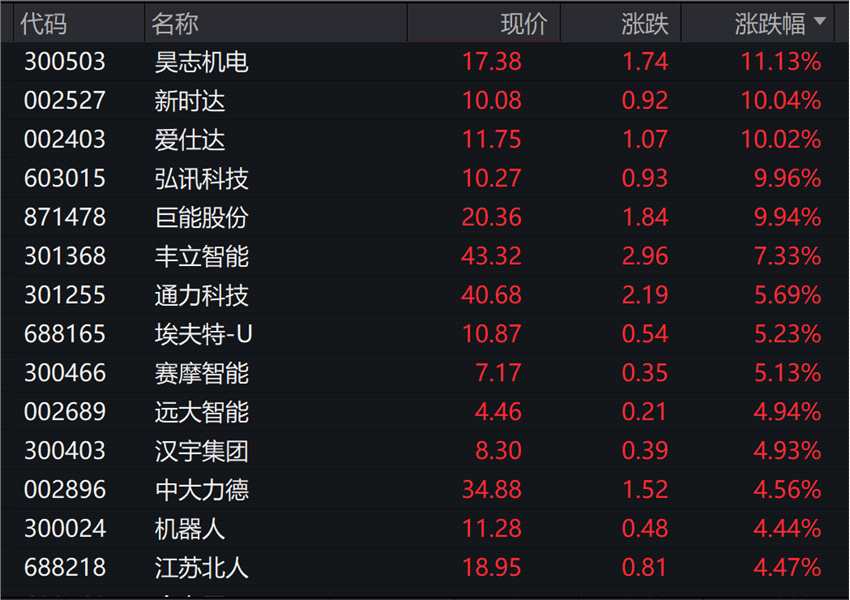 此外,新時達(dá)(002527)、弘訊科技(603015)、巨能股份跟風(fēng)漲停,昊志機(jī)電(300503)漲超10%,機(jī)器人、江蘇北人等跟漲。