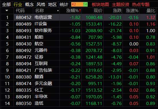 跌幅榜上,午后下跌板塊增多,電信、IT設備、軟件服務跌幅超過1%,船舶、航空、元器件、券商、釀酒、化工、半導體等板塊小幅下跌。