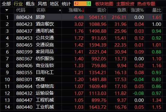 板塊方面:除了旅游及酒店餐飲板塊外,機械、公共交通、紡織、煤炭、家居、日化等板塊整體漲幅超過1%;