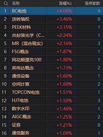 AI概念股迎來反彈,CPO方向領漲,聯(lián)特科技(301205)、中際旭創(chuàng)(300308)、萬興科技(300624)漲超10%,劍橋科技(603083)漲停。下跌方面,旅游等消費股陷入調整,大連圣亞(600593)跌停。板塊方面,BC電池、CPO、MR、證券等板塊漲幅居前,旅游、乳業(yè)、石油、零售等板塊跌幅居前。