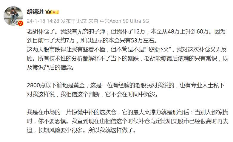 此外,老胡還特別聲明,這是個人的信念選擇,不呼吁任何人模仿自己。最后老胡表示,希望大A能夠早日重新站起來,等待反攻的沖鋒號。