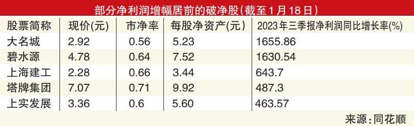 記者篩選出部分業(yè)績(jī)?cè)鲩L(zhǎng)穩(wěn)健的個(gè)股,其中,大名城(600094)和碧水源(300070)2023年三季報(bào)凈利潤(rùn)增長(zhǎng)均超16倍,目前市凈率僅在0.5倍至0.6倍之間;上海建工(600170)和塔牌集團(tuán)(002233)等29只個(gè)股去年三季度凈利潤(rùn)翻番,目前股價(jià)也是低于每股凈資產(chǎn);還有一些股票相當(dāng)于五折出售,如建發(fā)股份(600153),市凈率為0.52倍,每股凈資產(chǎn)為18.51元,目前股價(jià)為9.69元。