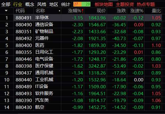 板塊方面:今日半導(dǎo)體、通信、日化、元器件、醫(yī)藥、汽車等板塊走弱;CRO概念股午后集體跳水,藥明康德(603259)跌停。