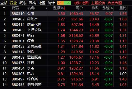 滬指全天圍繞2900點(diǎn)窄幅震蕩,深證指數(shù)及創(chuàng)業(yè)板指走勢較弱,受疊加利好刺激,房地產(chǎn)板塊持續(xù)走好,全天領(lǐng)漲大盤,整體漲幅超過3%,石油板塊尾盤突然發(fā)力,躍居漲幅榜首位,中石油盤中漲超6%,交通、銀行、鋼鐵、煤炭、運(yùn)輸、電力等板塊午后尾盤漲幅擴(kuò)大,拉動(dòng)滬指翻紅;