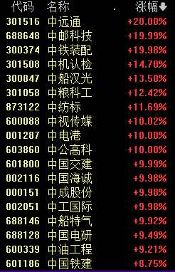 今天上午,“中”字頭繼續(xù)反彈,【中遠(yuǎn)通(301516)、股吧】(301516)、中郵科技等多股漲停。