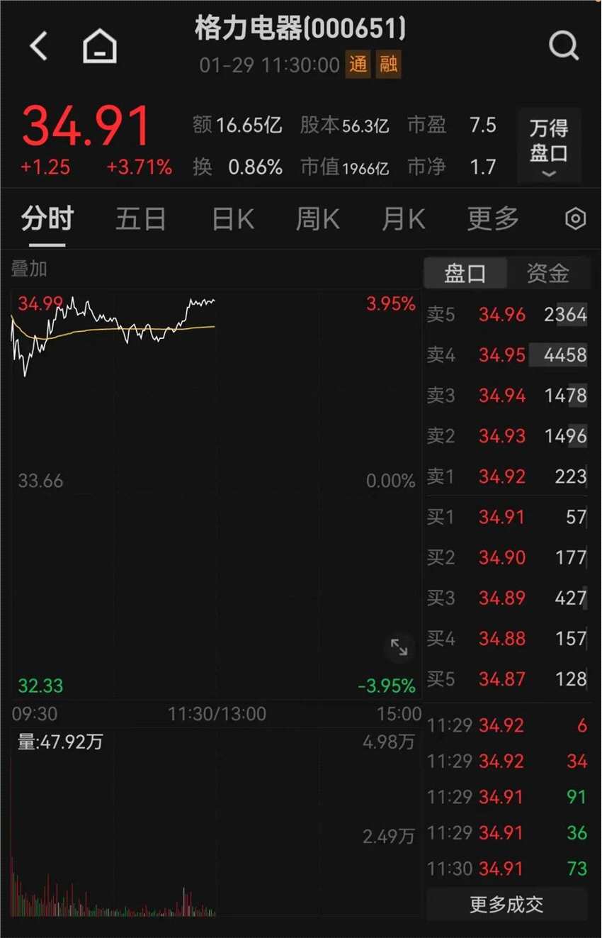 1月29日,格力電器開(kāi)盤上攻,截至午間收盤,股價(jià)上漲3.71%,最新市值逼近2000億元大關(guān)。