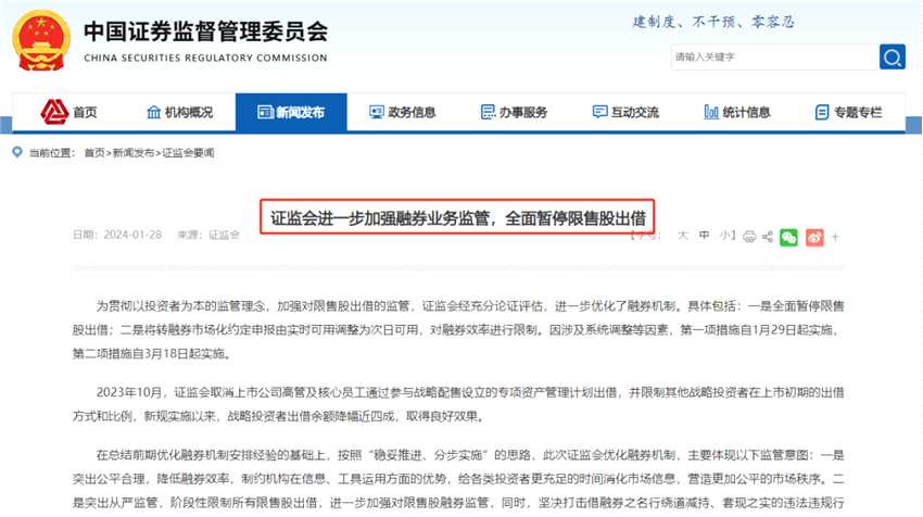其中,“完善融券監(jiān)管規(guī)則”被重點提及,成為證監(jiān)會部署2024年工作的重點。1月28日,證監(jiān)會就優(yōu)化了融券機制,進一步穩(wěn)定了市場預期。