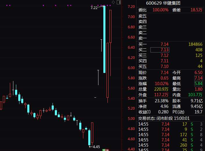 值得關注的是,華建集團(600629)連續(xù)2日上演“地天板”。在上周連續(xù)4漲停后,本周一華建集團漲停開盤,后在尾盤閃崩跳水跌停,上演“天地板”。昨日慣性低開低走,盤中一度觸及跌停,但隨后又放量開始拉升至漲停。今日再度復制昨日走勢,先殺至跌停,后又拉至漲停收盤。近7個交易日6漲停1跌停。