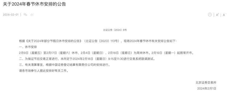 北交所同日公告,根據(jù)《關(guān)于2024年部分節(jié)假日休市安排的公告》(北證公告〔2023〕113號(hào)),現(xiàn)將2024年春節(jié)休市有關(guān)安排公告如下: