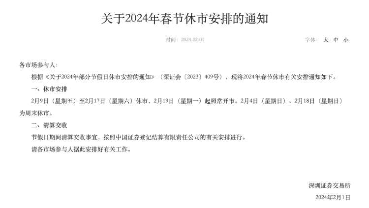 2月1日,滬深北交易所發(fā)布2024年春節(jié)休市安排公告,自2月9日(除夕)起休市,共休市10天。2月19日(正月初十)起開市。