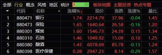 板塊方面:銀行、煤炭、石油、電力板塊護(hù)盤(pán)意圖明顯,午后,醫(yī)療、釀酒、保險(xiǎn)、家電等板塊翻紅;