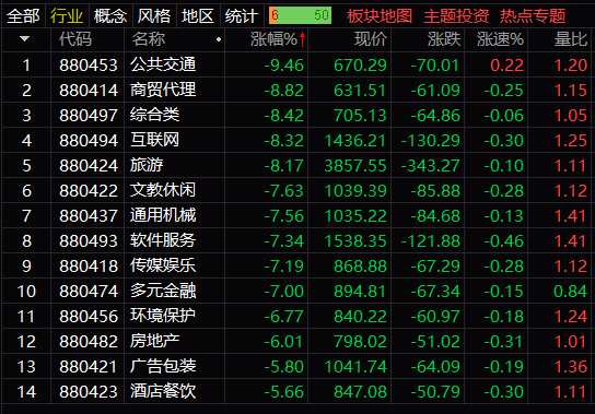 跌幅榜上,公共交通、旅游、互聯(lián)網(wǎng)、傳媒娛樂(lè)、通用機(jī)械、軟件服務(wù)等板塊跌幅收窄,但整體跌幅仍較大;