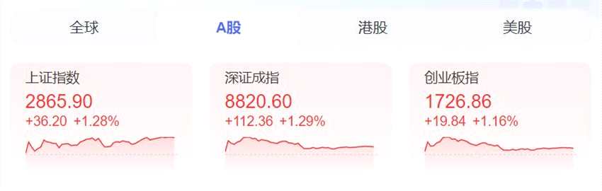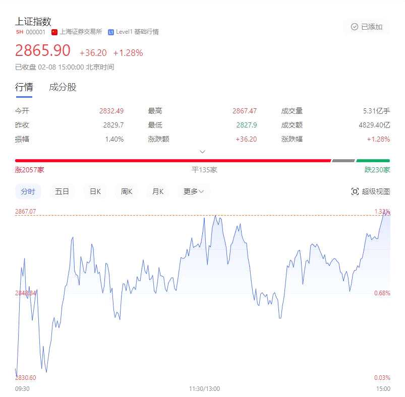 2月8日,兔年最后一個交易日,三大股指高開高走全線飄紅,上證指數(shù)報2865.9點,漲1.28%,深成指報收8820.6點,漲1.29%,創(chuàng)業(yè)板指報收1726.86點,漲1.16%。兩市近4800只個股上漲,逾500股漲停。