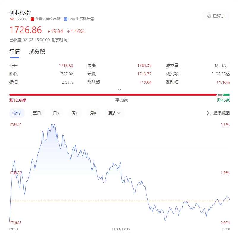 摘要: 2月8日,兔年最后一個交易日,三大股指高開高走全線飄紅,上證指數(shù)報2865.9點,漲1.28%,深成指報收8820.6點,漲1.29%,創(chuàng)業(yè)板指報收1726.86點,漲1.16%。